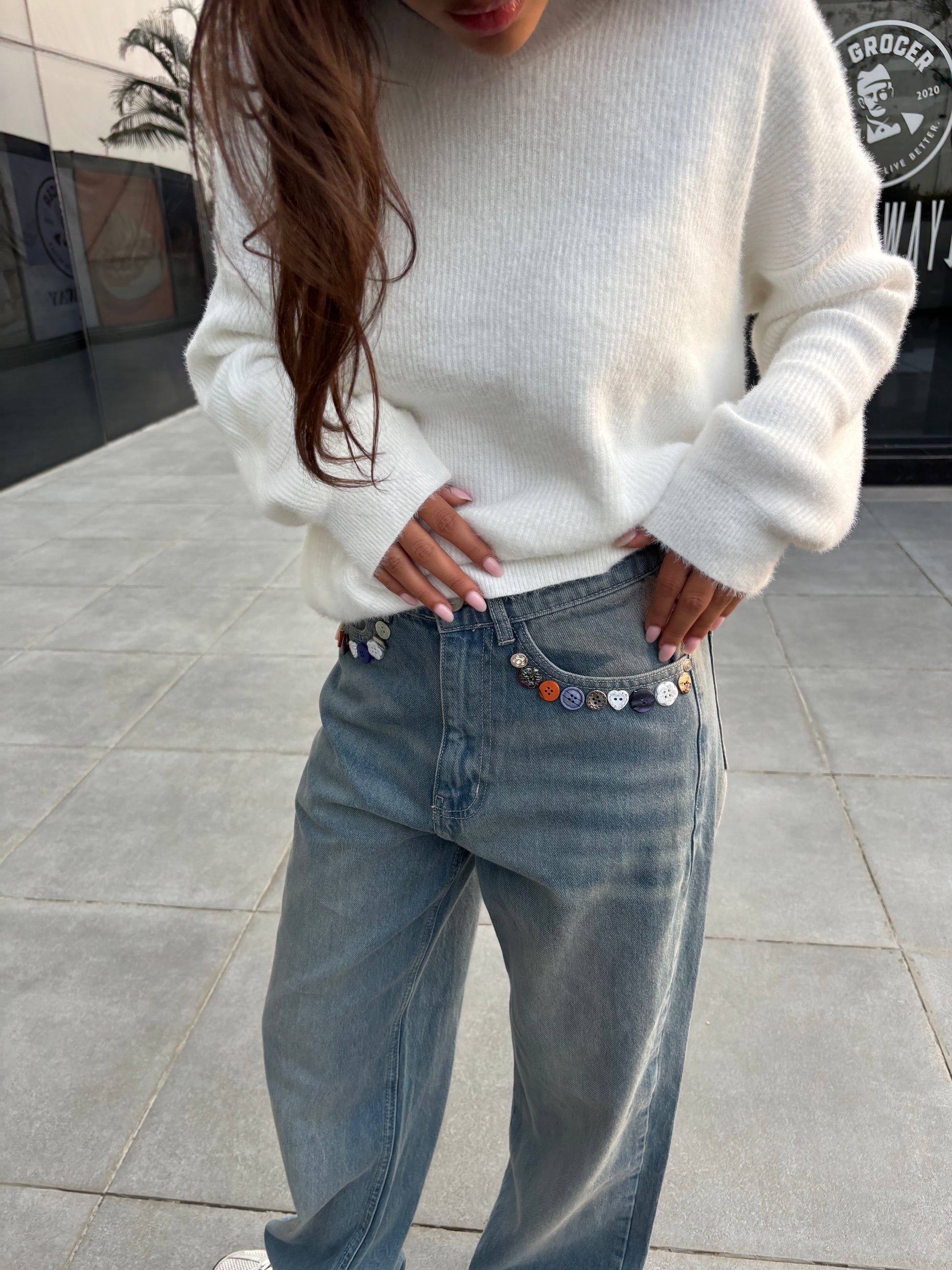 Make a bold statement with our Jeanius Button statement Denim, designed in a flattering wide-leg fit and crafted as a limited edition piece.